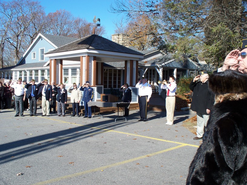 | Navy veteran Bob Harkins rendering a salute while Ben Morgan played taps. Rifle squad: Bob Callahan, Frank Nash, Anita King. |