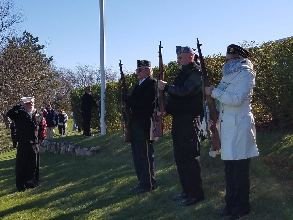 | Scituate American Legion Color Guard approaching. | Post Commander Covell on the right. |